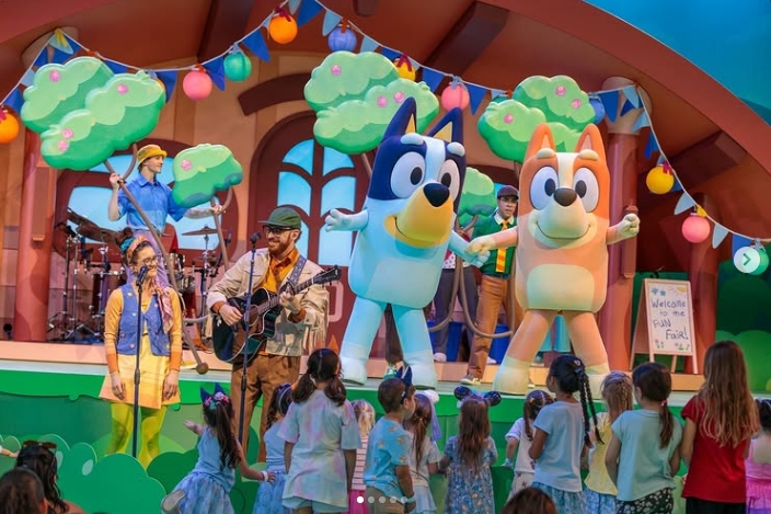 Throughout the day, Bluey and her sister Bingo appear live on stage, joining a troupe of comedic actors and musicians. Together, they bring to life the popular music and iconic games inspired by beloved Bluey episodes.