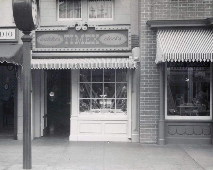 Present a complete display of watches available for purchase at this attraction. The U. S. Time Corporation also supplies many Timex clocks throughout Disneyland.