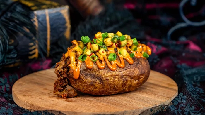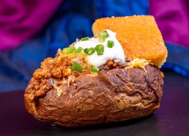 Indulge your appetite with a royal feast served from a medieval pavilion-style tent. Your taste buds will sing with seasoned pork bratwurst, loaded baked potatoes and either buttered or chili-lime corn on the cob.