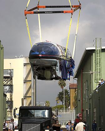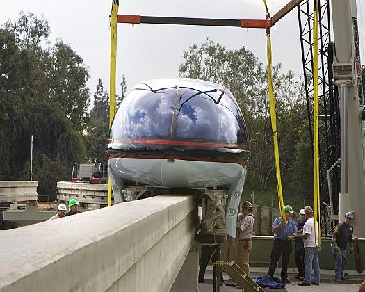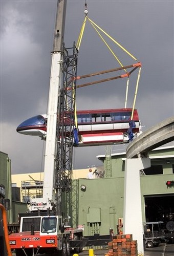 A 75-foot-tall crane hoisted the first of the new Mark VII monorails from a flatbed truck onto the beam way track this morning at Disneyland. The five-car burnt-burgundy train is the first of three new monorails expected to go online at the Anaheim ...
