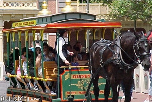 From WED Disneyland Dictionary 1968 Horse-Drawn Street Cars carry passengers aboard horse-drawn trolleys over 3.660 feet of tracks on Main Street from Town Square at Disneyland's entrance to the Plaza, heart of the "Magic Kingdom." Each of the four cars carries 23 persons and is drawn by one horse. A double track midway on the avenue.and circle routes at each end, enable cars to pass. Heavy duty draft horses are primarily Belgian and Percheron varieties.