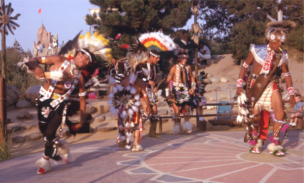 The Indian village added a touch of frontier authenticity in an area of the park that was otherwise only an imitation of the frontier experience. Disneyland's 1985 hardcover souvenir book proudly noted that the authentic dances from such tribes as the Apache, Navajo, Comanche and Pawnee were performed with the permission of the respective Tribal Council in the US Bureau of Indian Affairs. A Disney agent visited the Indian reservations of the Southwest and requested the chiefs to deliver him authentic Indians,which they did.Within a year the Indian village was relocated further north along the rivers west bank a spot at the center of Tom Sawyer's Island. This was a larger space with more development including an ornate dance circle additional teepees lodges a burial ground and the Indian War canoes.