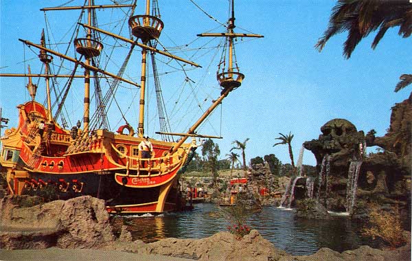 5 years after the Pirate Ship Restaurant opened in Fantasyland, a fully realize lagoon was finally built around the ship called both Skull Rock Cove and Pirates Cove. The shallow turquoise pond was shaped like a lopsided rectangle and covered about a quarter acre.Skull Rock was a 30 ft tall rock like sculpture rising on the north eastern shore.Skull Rock had an open mouth, craggy teeth, large open eye sockets that stared toward the ship, and a wide crack down its forehead.Waterfalls poured from the mouth and from either side of the skull. At night the eyes light up with an unearthly green color.