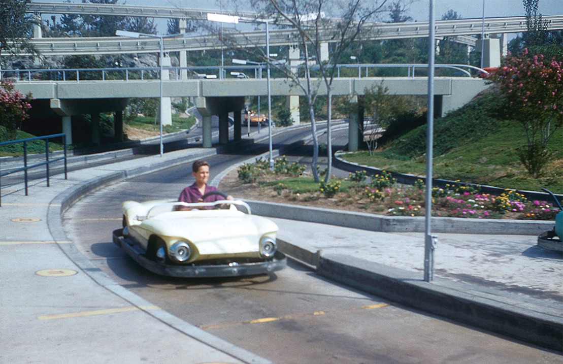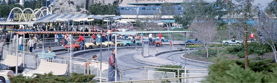 Of the four Autopias that have existed in Disneyland the one in Tomorrowland was the only Autopia up and running on opening day this original Autopia track curled across the approximately 3 unlandscaped acres of Disneyland's eastern edge with most of the track design attributed by to Disney Legend Mark Davis.