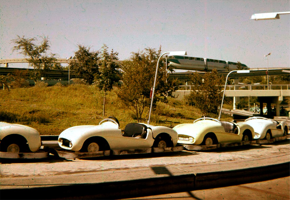 For the first decade of operation the attraction did not have a guide rail running down its center which means drivers could veer their cars into each other pass each other and in some cases even managed to go against traffic not until 1965 was a center rail installed down the middle of the Autopia free way to keep cars aligned.The earliest sketches show a bulbous heavy fenders and running boards on the cars just like on classic American autos of the 40s and 50s thus making the cars of the future really more like cars of the recent past the Mark I cars that hit the Tomorrowland Road in 1955 they were modeled on foreign sports cars Porsches and Ferraris in particular to give them a sleek low slung look that anticipated styles of the next decade if not quite the next century.