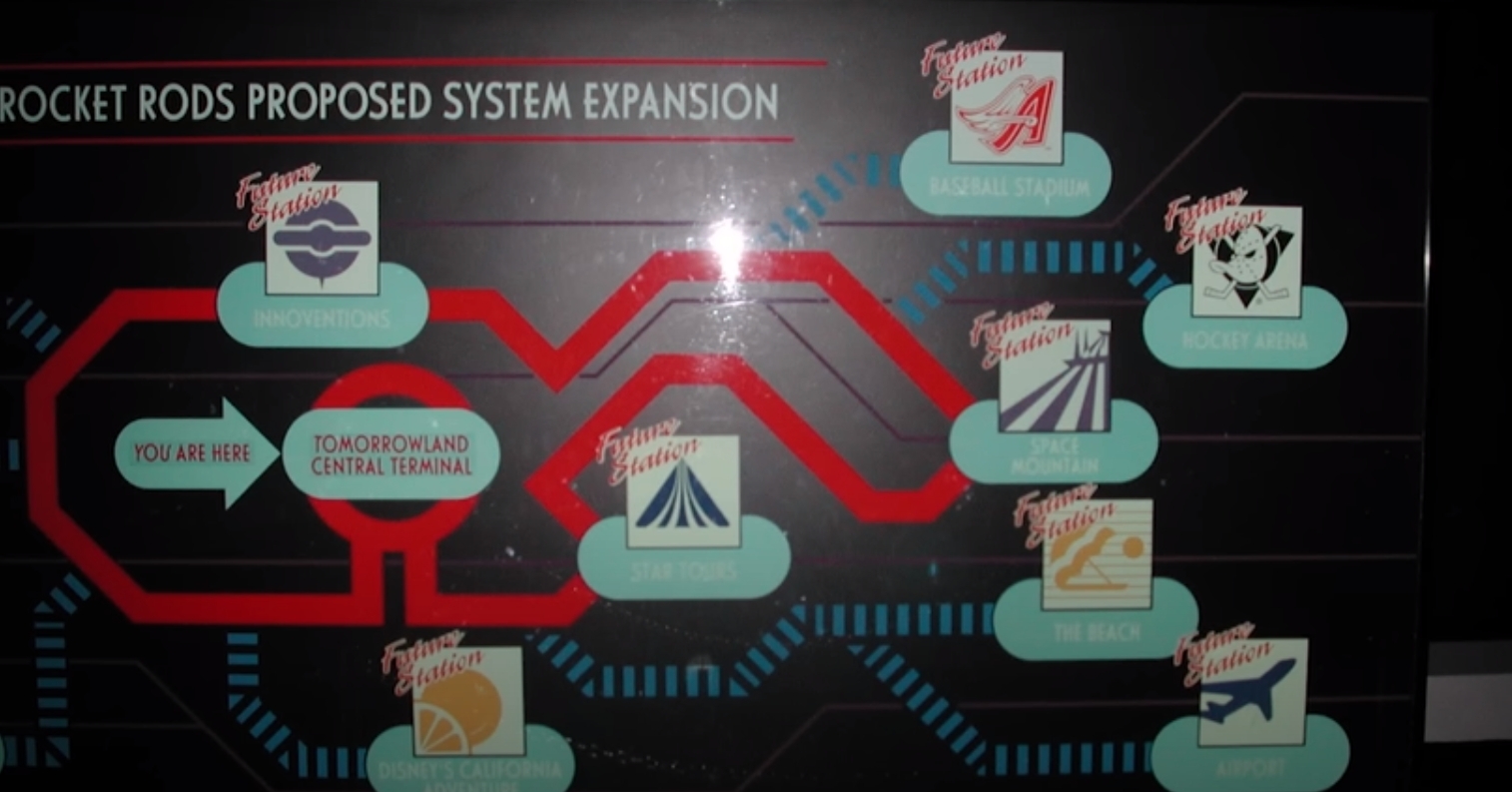 The Rocket Rods zoom above through and around Tomorrowland in the fastest and longest attraction in Disneyland Park this thrilling experience puts guests behind the wheels of high-speed vehicles of the future as they tear along an elevated highway above Tomorrowland.So read the ambitious description of the Rocket Rods in Disneyland 2000 souvenir book. Ride The Road To Tomorrow was the hyperbole and ambitious concept proud boast at the attractions entrance. Unfortunately, the rocket rods disappointing reality never match the printed entrance making their failure all the more glaring.What should have been an exciting new 30 mile per hour thrill ride for the 21st century barely sputtered through the last year of the 20th even more embarrassingly the Rocket Rods were built to be high-profile showpiece attraction at Tomorrowland