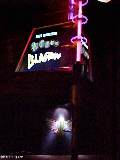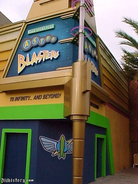 Needing a hit Tomorrowland attraction that would generate some positive buzz after the problematic Rocket Rods expired in 2001 Disneyland designers looked to other Disney theme parks for inspiration. Buzz Lightyear Space Ranger Spin at Walt Disney World and Buzz Lightyear's Astro Blasters at Tokyo Disneyland were already high-flying successes. So the theme for the next installation seemed obvious.In Disneyland the Astroblasters zoomed into the former pre-show and theater rooms of the old Circarama Theater. What was a Mary Blair design tile mosaic on the curving exterior became a painted mural showing speeding rockets floating space mountains and fantastic planets.Inside the attraction features characters and themes from Toy Story all intensified by bright neon colors Buzz himself makes an appearance as a sophisticated audio-animatronic character.