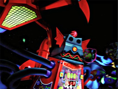 An Audio-Animatronic Buzz Lightyear figure and giant Etch-a-Sketch provide explanation of the "mission", which is to destroy Zurg's secret weapon with your blasters. While his body is audio-animatronic, Buzz's face is actually a screen with a projection of computer animation, allowing better lipsync and more expressive features, making him look like a more realistic representation of the character from the films.Astro Blasters is equal parts shooting gallery and dark ride. Visitors board an Omnimover space vehicle featuring two laser pistols and a joystick. The pistols are used to shoot laser beams at targets of varying point values.