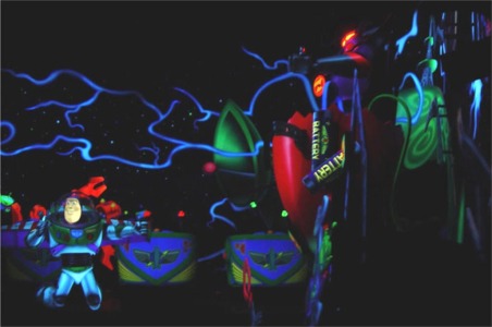 As described on the sign out front the attraction is an interactive adventure in which you travel aboard slow-movingspaceships that you can spin while helping Buzz Lightyear battle the evil Emperor Zurg. The spaceships a new iteration of the Omnimover system first develop in the 60s are indeed slow, but guests really can spin them 360 degrees.What makes this four and a half minute ride popular enough to necessitate the fast pass tickets center outside is the interactive shoot-em-up element. As passengers wind through the 10 different space scenes they use their own laser cannons to blast away at different targets with various point values. Point totals display inside the cockpit and rankings from Star Cadet to Galactic Hero are posted at the end of the ride.